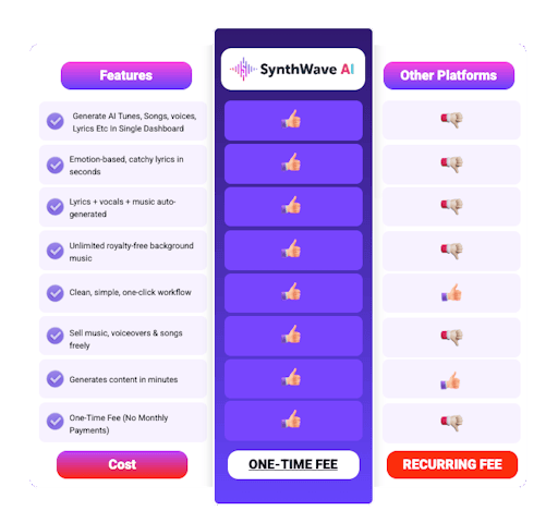 SynthWave AI replaces multiple platforms at once — music creation, voice generation, lyrics writing, full song production, and video background music — all inside one simple dashboard, with Commercial Rights included.
