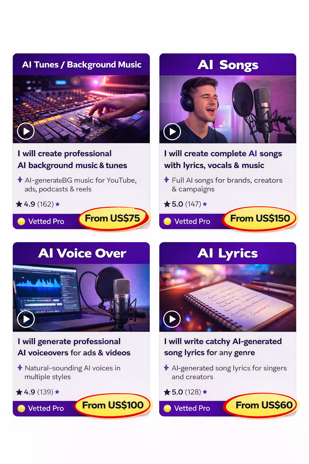 Download, export & sell your AI-generated tunes, songs & voiceovers on Fiverr, YouTube, Reels, Podcasts & client projects.